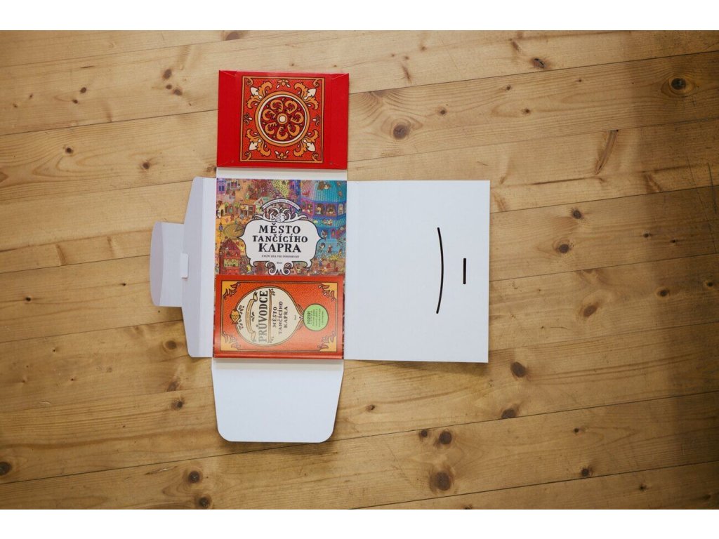 Město Tančícího kapra obsahuje velkoformátovou hledací knihu (snad ještě desetkrát zaplněnější než geniální Mapy!), kterou doprovází brožovaný Průvodce — game book —, podle nějž čtenář postupuje městem a řeší úkoly. A navíc také sedm archů se samolepkami (lze je použít opakovaně), díky nimž získává hra další rozměr.