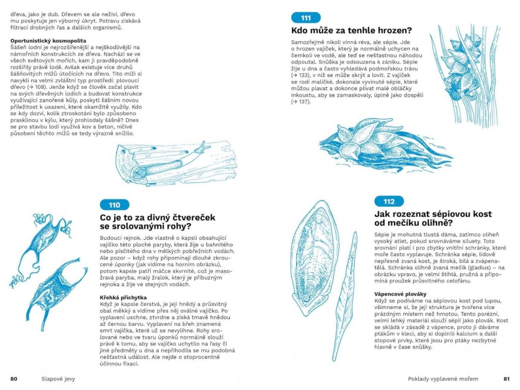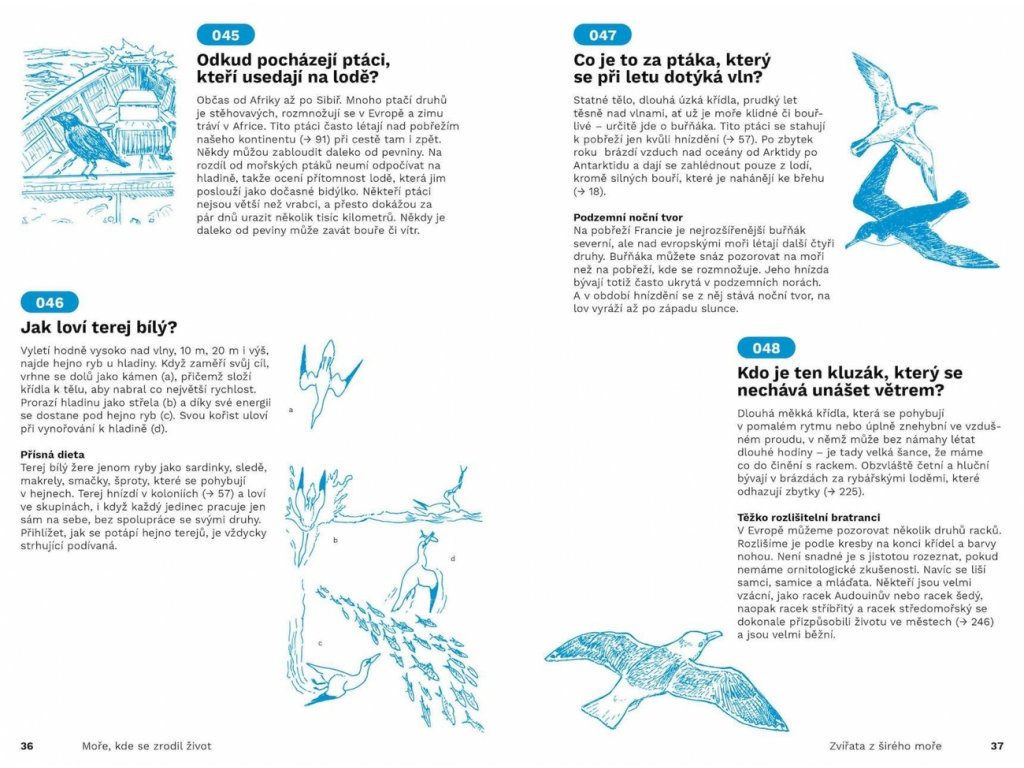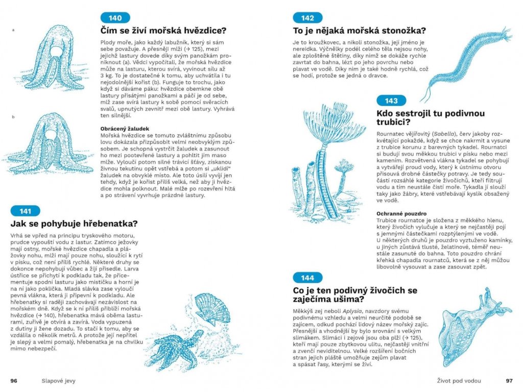 Existovala moře a oceány vždycky? Jak staré jsou oceány? Jaký je rozdíl mezi mořem a oceánem? Jak vzniká oceán? Je moře vždycky uzavřené? Proč je moře slané? Proč je moře modré? Může moře zamrznout? Jak to, že moře nepřeteče, při tom množství vody z řek? Zdvihne změna klimatu hladiny moří? Jaká je maximální hloubka oceánů? Čemu námořníci říkají úplné bezvětří? Co je vlnění? Proč máme mořskou nemoc? Jak vznikají vlny? Proč ráno fouká vítr od pevniny k moři a večer naopak? Co je to vítr o síle 8? Jaké jevy jsou předzvěstí bouře? Co můžeme dělat proti bouřce? Jak se v moři zrodil život? Kdy se život v moři objevil? Co víme o prvních živých tvorech v prvotním moři? Co jsme si uchovali z dob, kdy naši vzdálení předci žili v mořích? Proč mořská ryba zahyne, když ji vložíme do sladké vody? Proč hrad z písku nespadne? Jak vzniká duna? Existuje rozdíl mezi dunami v poušti a dunami na pláži? Jaké rostliny můžou růst na útesech? Na jakém místě světa jsou slapy největší? Jak poznat plže od mlže? Dají se rostliny z pláže jíst? Co je to za velké jelito? Je mořská sasanka živočich, nebo rostlina? Jak se slávky přichytávají ke skále? Kdo v písku vyhloubil ty dvě dírky? Co je to za velké zvíře na písčině? Proč jsou řasy lepkavé? Kde se berou mycí houby? Kdo vymyslel chov ústřic? Jak se vyhnout úžehu? Co je to nelegální vypouštění nádrží? Je pravda, že rybáři můžou chytat delfíny? Proč nemáme loď kotvit, kdekoli nás napadne? A tak dále a dále...
