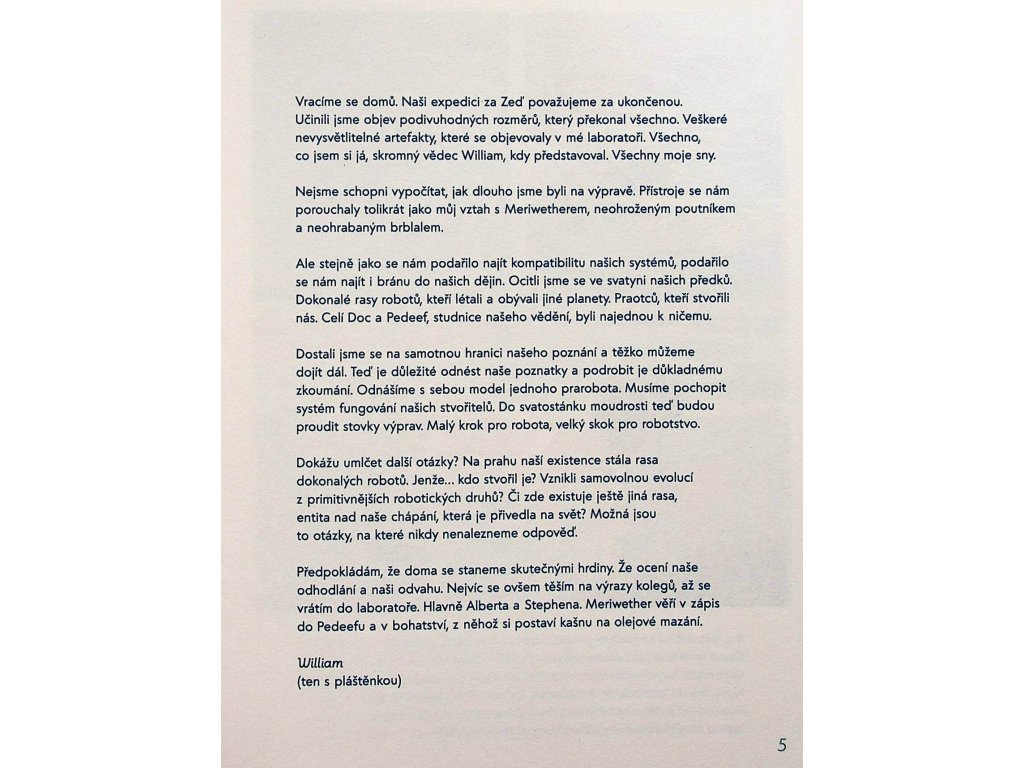 Na druhém dílu robotího putování se podílelo opět autorské duo Taťána Rubášová, scenáristka a režisérka, s Jindřichem Janíčkem, ilustrátorem a absolventem Univerzity Tomáše Bati ve Zlíně a Ateliéru ilustrace na UMPRUM. Komiksově pojatá kniha nezapomíná ani na dobrodružství, ani na humor a věnuje se ekologii a druhům smutku.